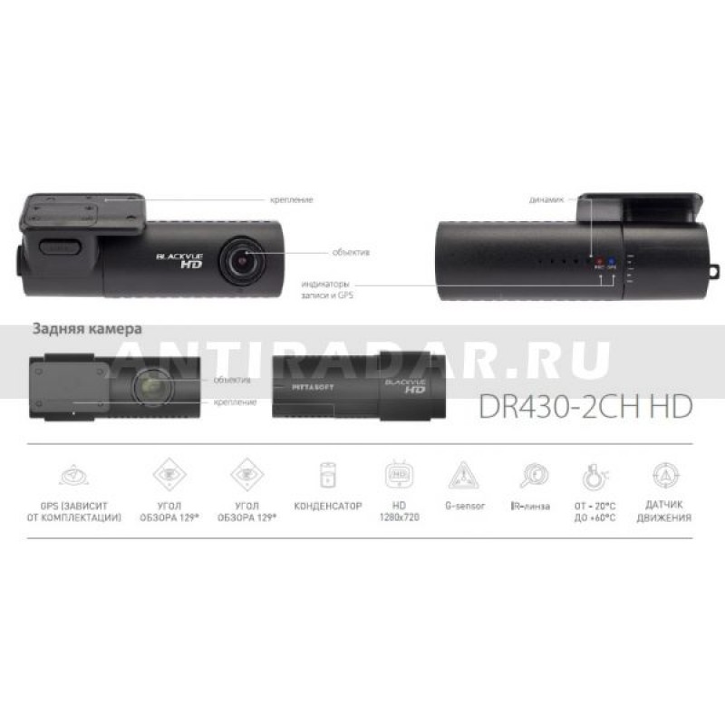 BlackVue DR430-2CH — младший брат старшей модели DR650. Видеосъёмка осуществляется в формате HD-ready (1280x720), скоростью 30 кадров в секунду (обе камеры).