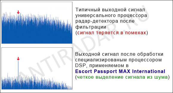 DSP - "о, сколько нам открытий чудных (с) А.С. Пушкин" Обработка сигнала специализированным контроллером дает постоянно превосходный результат по выделению и фильтрованию полезного сигнала в всех частотах. В результате катастрофически сильно падает прием ложных сигналов, даже по сравнению с Escort RedLine RU. Так же гибкая архитектура микроконтроллера позволяет апгрейдить его для опознавания новых разновидностей режимов работы радаров путем простой перепрошивки основной программы микроконтроллера SPARTAN-6. В результате мы видим эволюции системы опознавания сигналов путем минимизации затрат. Так же интересный момент, Escort 9500ix RU со своим едиными микропроцессором, делил частотный диапазон "K" на 30 МГц сегменты для системы TrueLock. А Escort MAX International со своей высокой разрешающей способностью сигнала уже может делать на 10 МГц сегменты для этой же системы, что повышает четкость границ, если имеет место два и более граничных сигналов в этом диапазоне. Весь спектр какой-либо принимаемой частоты делится на 500 и более индивидуальных сегментов в хаотичном порядке. Для того проработать каждый сегмент, Escort Passport MAX Intl требуется доля миллисекунды. Это решение напрямую зависимо от новой технологии. В стандартной архитектуре, используемой в Escort 9500ix RU или Escort RedLine RU, использовался полностью аналоговый 8-ми битный микроконтроллер с частотой 16 МГц, на который подавался редуцированный сигнал с гетеродина в аналоговой форме, и имел выходной сигнал тоже в аналоговой форме дял подачи в основной микропроцессор. Используя НОВУЮ технологию с DSP чипом, платформа получилось полностью цифровой с исключением промежуточных аналоговых форм. В дальнейшем это откроет новую эру в возможностях радар-детекторов от Escort.
