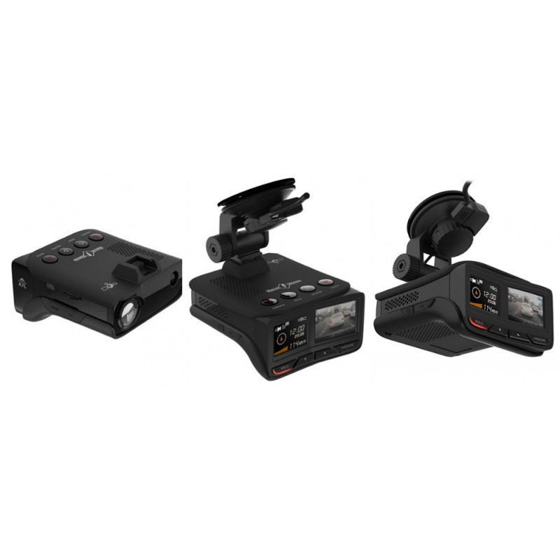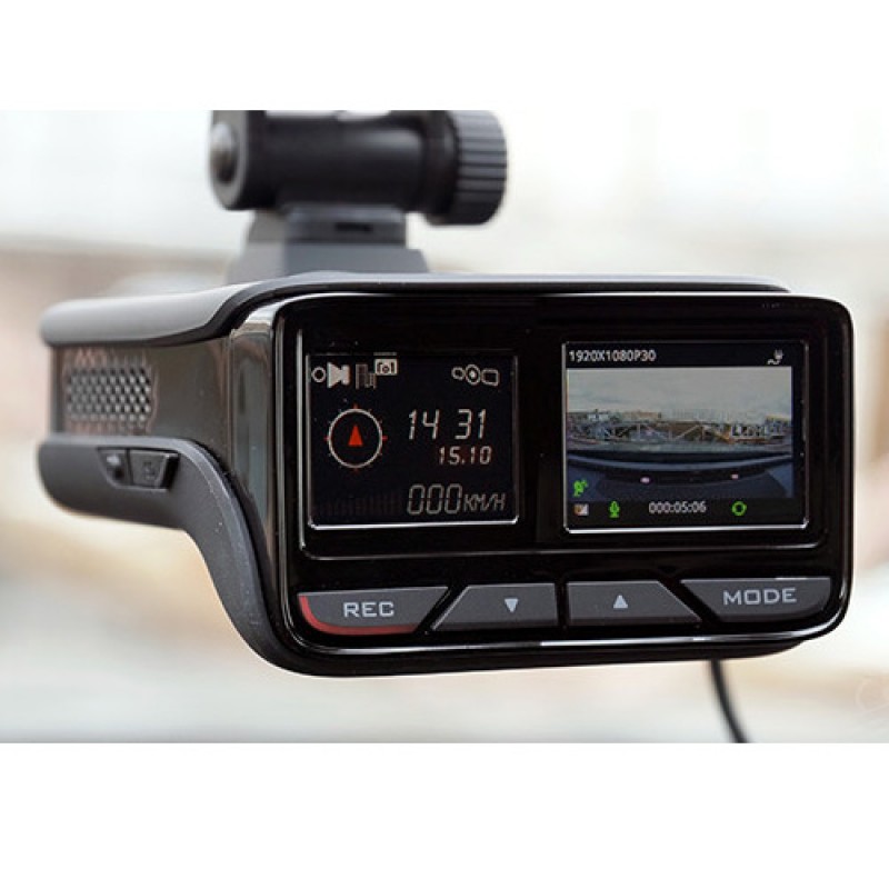 На корпусе предусмотрено 2 экрана. На первый выводится информация с радар-детектора, а на второй транслируется картинка с камеры, на котором можно воспроизвести ролик в экстренном случае, например, после ДТП.